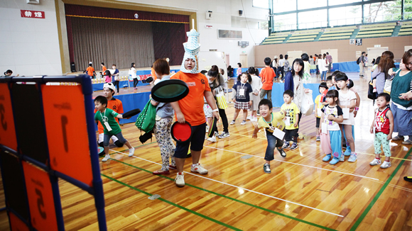 今回は文化祭のようにいくつかのブースを作り、いつでも参加できる形にしました。子ども達はスタンプカードを持ち、各ブースでスタンプをもらいます。すると「カエルをさがせ」と言う文が出来上がります。カエルに扮装したスタッフを探し当てたら駄菓子をプレゼント。