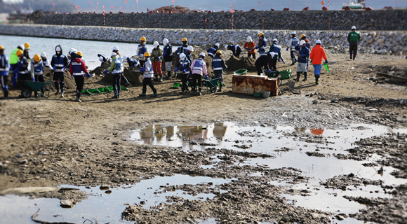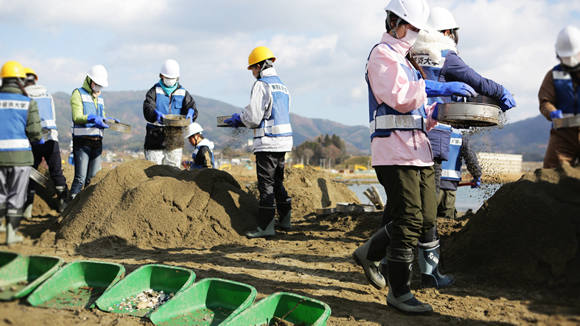 続いて古川沼でのガレキ撤去の現場を視察しました。陸前高田市では津波の被害による死者が1556名、行方不明者が223名(2012年9月11日発表)です。陸前高田市復興サポートステーションでは髪の毛一本を探し行方不明者を一名でも減らす為に撤去作業を行っています。前日協力頂いた東京経済大学の皆さんも作業をしていました。