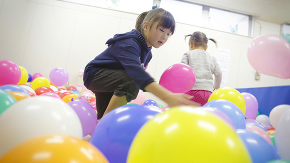 秘密の部屋の中は風船であふれていて、歩くと鈴の音が聞こえます。たくさんの風船の中から鈴の入った風船を探し出して、受付に持って行くと駄菓子が貰えます。